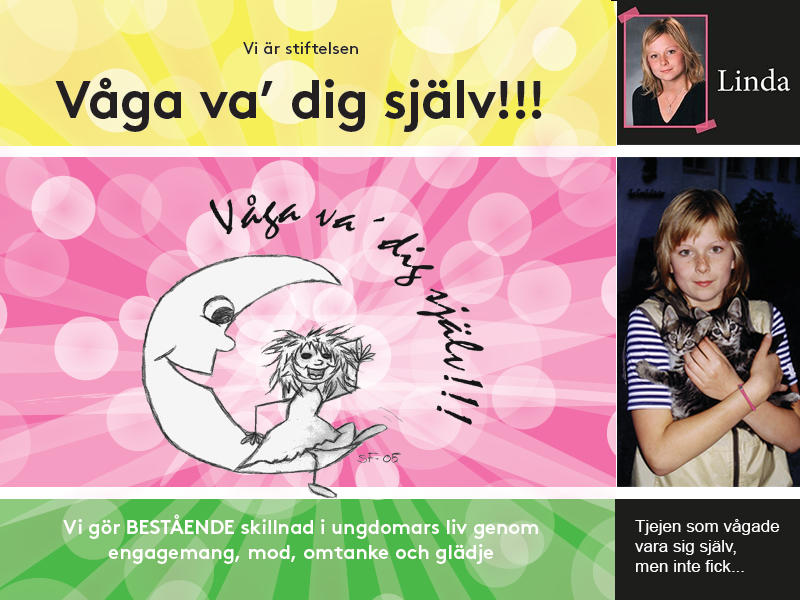 Vår familjs väg ur detta fasansfulla trauma var att år 2005 starta Stiftelsen "Våga va´dig själv"!!!. Via goda exempel och förebilder arrangerar vi aktiviteter för både ungdomar och vuxna.